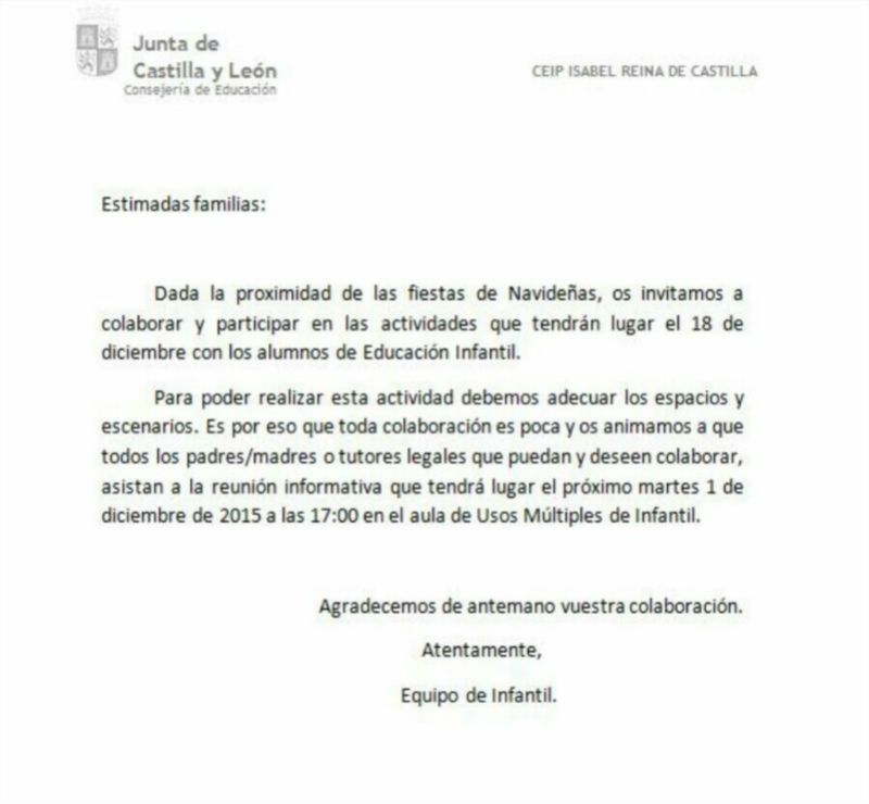 Papás, mamás y/o tutores/as de Educación Infantil. Nos hemos enterado ayer a última hora de la tarde de que hoy hay una reunión para hablar de las actuaciones navideñas de nuestr@s pequeñ@s. Lo compartimos con vosotr@s por si algun@ no lo sabéis todavía. Creemos que es importante para tid@s, padres y nin@s, por lo que, desde el AMPA os animamos a asistir.